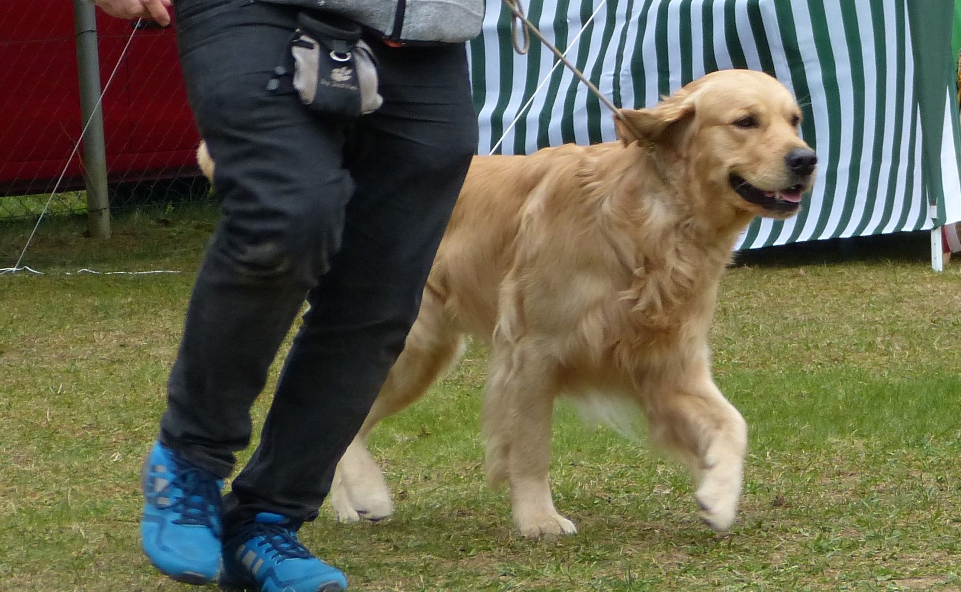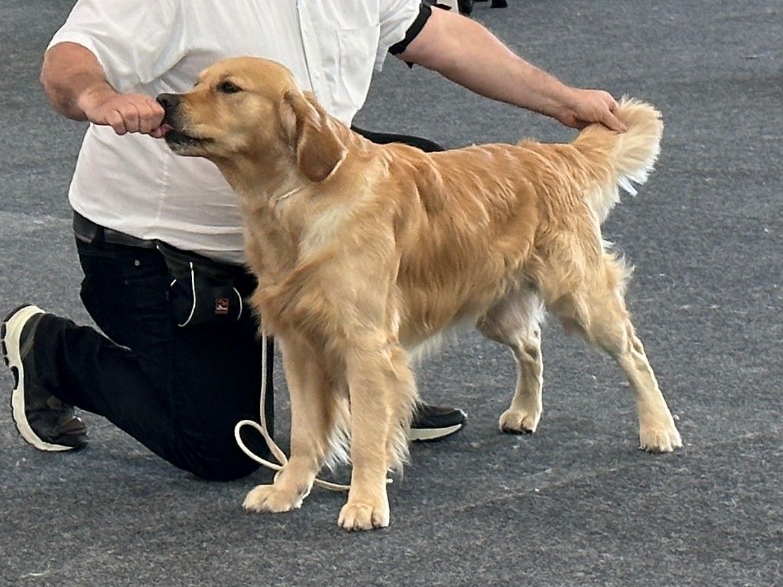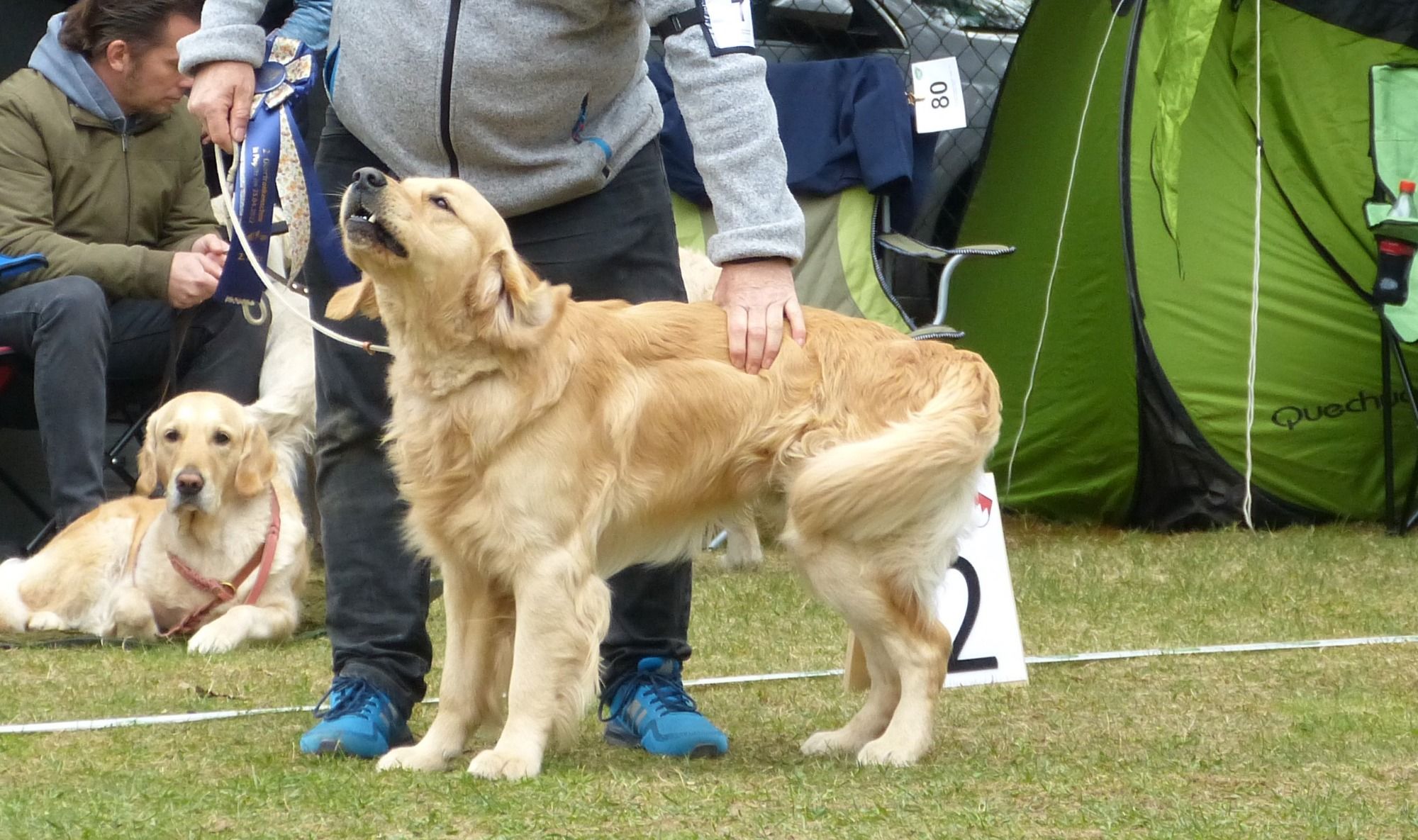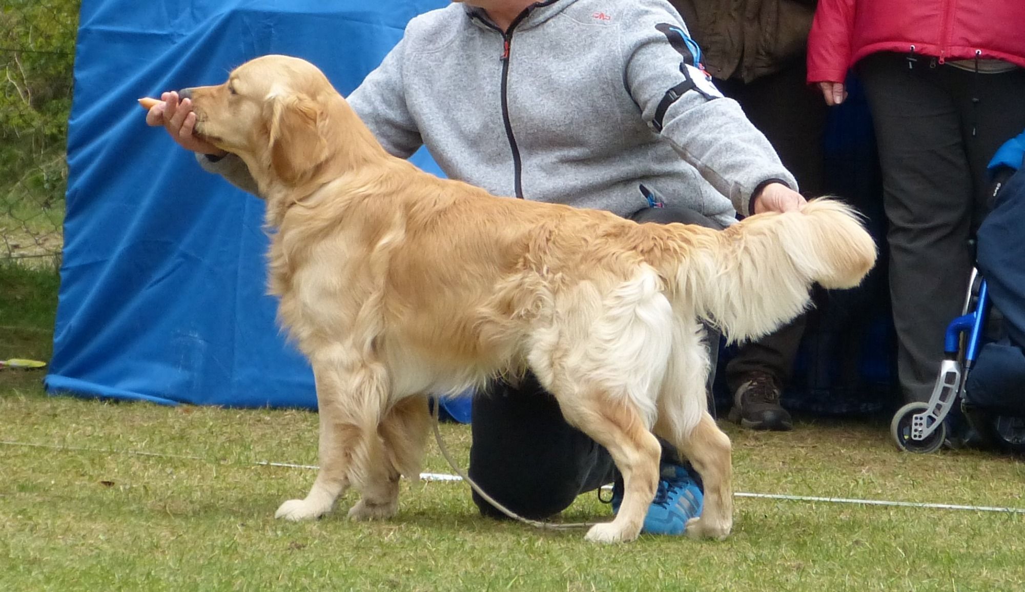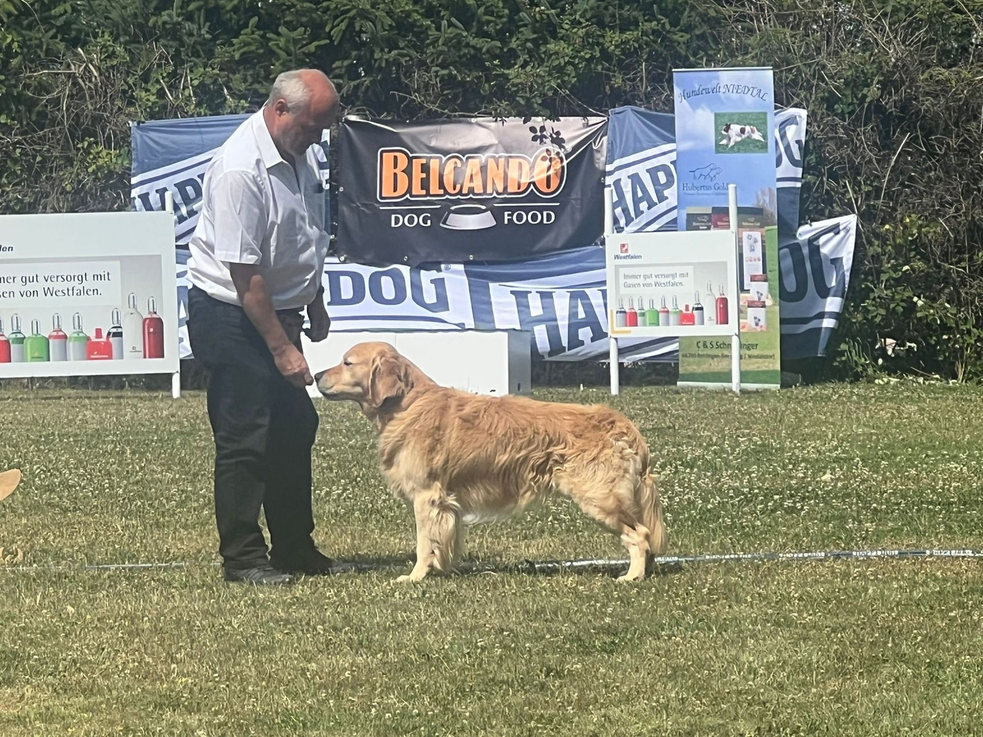 "3 Jahre alter goldener Rüde, vorzügliche Größe, markanter Kopf, steile Vorhandwinkelung, schmale Brust, gerade obere Linie, kräftige Lenden, vorzügliche Hinterhandwinkelung, vorzügliches Haarkleid "